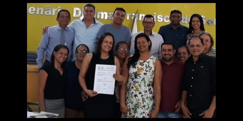 Ladeada por seus colegas vereadores e por profissionais da educação, a vereadora Raiza exibe o projeto aprovado pelo Legislativo