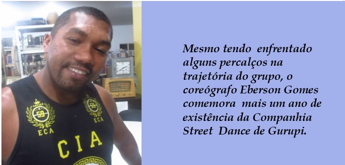 Na coordenação da Companhia Street Dance, o coreógrafo Ebersom Gomes, desde adolescente é visto nas rodas de dança de rua em Gurupi, experimentando os passos da arte que um dia iriam lhe abrir outras portas, como concluir o curso superior, por exemplo. Natural da Capital da Amizade, Ebersom formou-se em Artes Cênicas pelo IFTO – Campus de Gurupi. Atualmente, ele é professor no Colégio da Polícia Militar Presidente Costa e Silva, onde ministra aulas na disciplina de dança e eletivas. Ele também é parceiro no projeto Cultura e Arte por toda a parte, da Secretaria de Cultura de Gurupi.