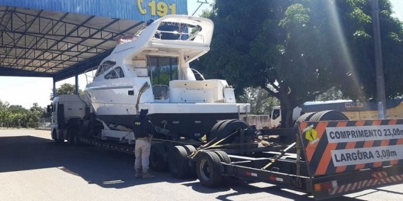 A Polícia Rodoviária Federal (PRF) abordou caminhão-prancha transportando lancha de forma irregular. Para transportar uma lancha como a flagrada, seria necessário Autorização Especial de Trânsito (AET) e batedor, tendo em vista as grandes dimensões da lancha.