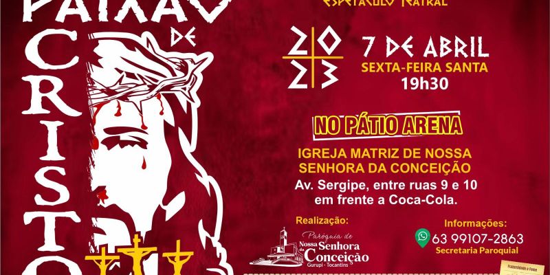 Tradição na Semana Santa de Gurupi, a encenação da Paixão de Cristo realizada pela Paróquia de Nossa Senhora da Conceição, volta a ser realizada pelo Grupo de Teatro Paixão de Cristo, no dia 7 de abril, às 19:30h, no estacionamento da paroquia na Av. Sergipe - Trevo Oeste.