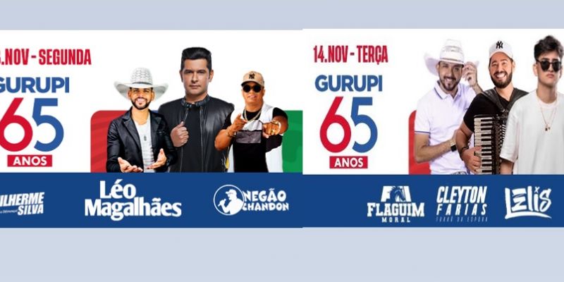 Os shows acontecerão no palco que será montado na Avenida Pará, próximo à sede da Fundação UnirG, mesmo local onde é realizado há vários anos o Carnaval de Gurupi. Os dois dias de shows terão início no dia 13 de novembro, véspera do aniversário de Gurupi, e as atrações da primeira noite serão: Léo Magalhães, Guilherme Silva e Negão Chandon (shows viabilizados pelo deputado Gutierres Torquato). Já no dia 14, as atrações musicais são as seguintes: Flaguim Moral; Cleiton Farias & Forró da Espora e DJ Lélis.