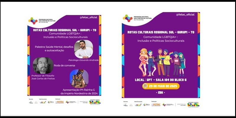 A cidade de Gurupi vai receber no próximo dia 29 de maio a ação Rotas Culturais Tocantins, que terá como tema central: Comunidade LGBTQIA+ – Inclusão e Políticas Socioculturais.  O evento acontece às 19 horas na Sala 104, Bloco G, da Universidade Federal do Tocantins (UFT), Campus de Gurupi